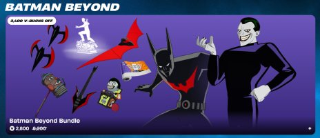 The Batman Beyond Bundle includes over ten items and is priced at 2,600 V-bucks, Fortnite‘s in-game currency. Available items include the Batman Beyond skin (1,500 V-Bucks separately), the Joker Beyond skin (1,500 V-Bucks separately), the Batman Beyond Wings glider (800 V-Bucks separately), the Batarang (Beyond) pickaxe and back bling (800 V-Bucks separately), the Joker In The Box back bling (300 V-Bucks separately), the Batman’s Surveillance emote (300 V-Bucks separately), the Jolly Jack Sledge pickaxe (800 V-Bucks separately), the 3 Jokerz Monte wrap (500 V-Bucks separately), and the Batman Beyond Axe guitar (800 V-Bucks separately).
